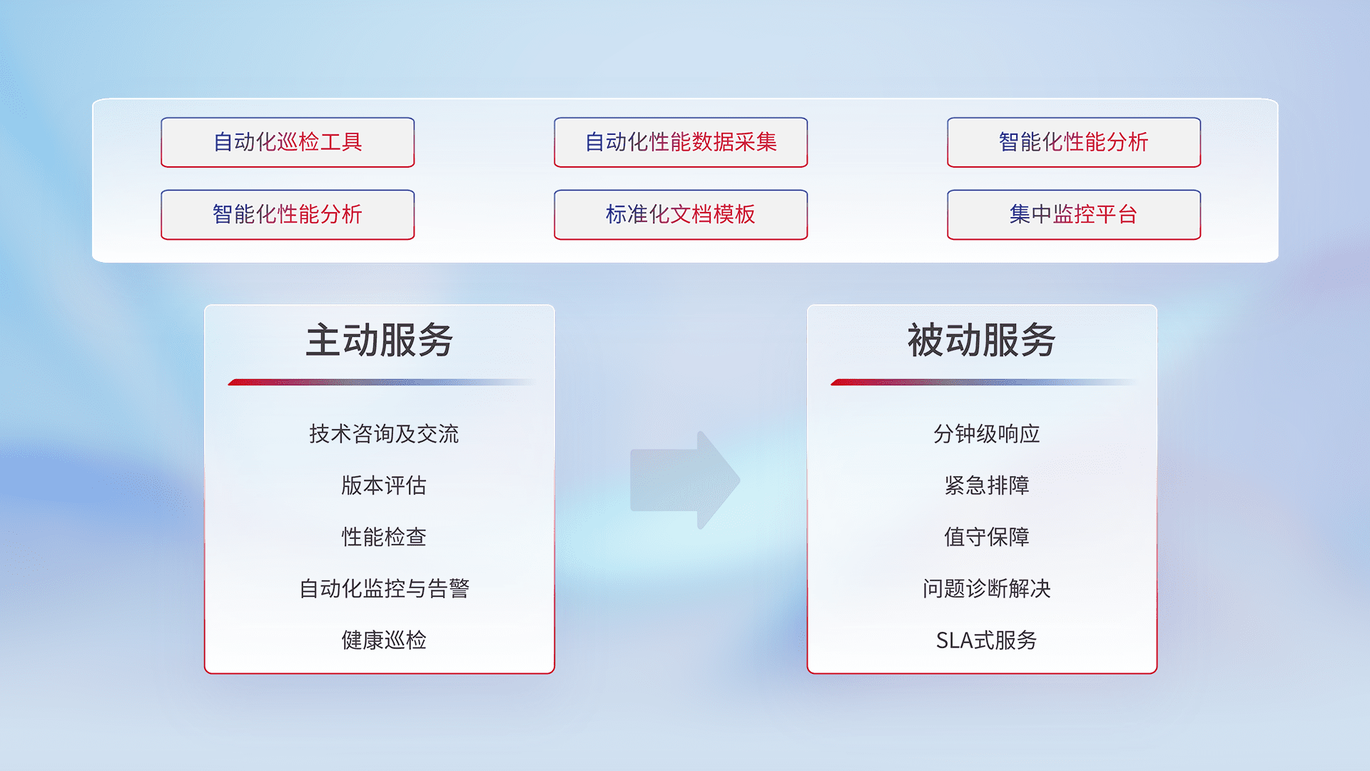 智能化工具和标准化文档,,保障服务质量,,,提供主动服务(包含技术咨询、、版本评估、、性能检查、、、、自动化监控与告警、、、健康巡检)和被动服务包含(分钟级响应、、、紧急排障、、、值守保障、、、问题诊断解决、、、、SLA服务)。。。。