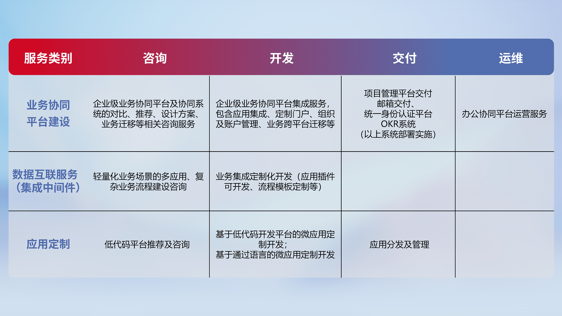 针对钉钉、、、、企微、、、、IDaas等平台级产品提供产品的规划、、方案、、、、交付、、、、定制化开发等服务,,,实现如统一协同办公、、、、智能客户服务、、、混合会议管理、、、、智能数据查询、、、、等业务场景,,,,实现数字化转型。。。